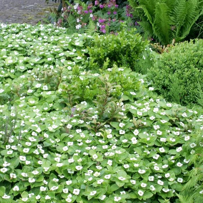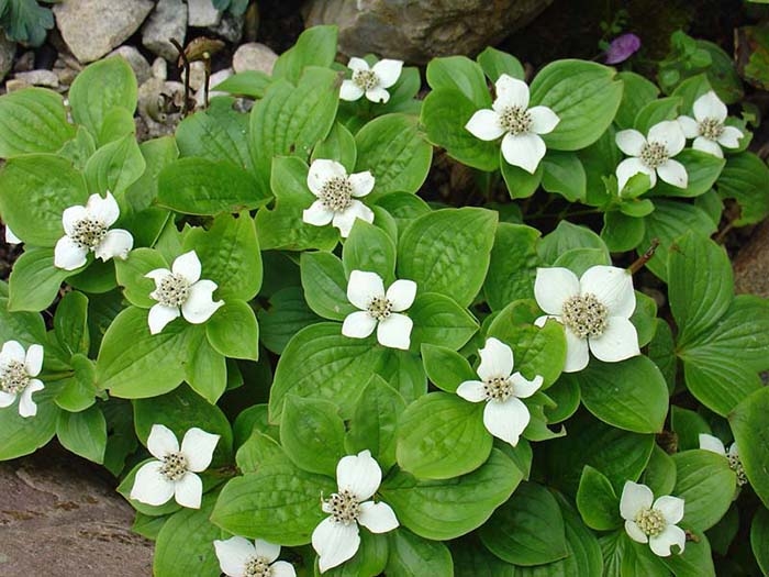 Саженцы канадского дерена образуют эффектные ковры, плотно покрывая почву зеленой листвой. Во время интенсивного цветения карликовые кустарники выпускают множество белых цветов, которые затем становятся красными неядовитыми ягодами. Используется в качестве почвопокровного растения.