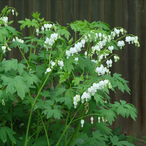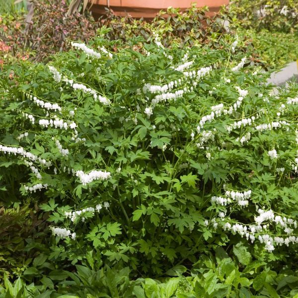 Рассада Дицентры великолепной Alba (Альба) привнесет в цветник немного экзотики. Необыкновенные цветки этого растения, похожие на «разбитые» белые плоские сердечки (до 3 см диаметром) располагаются длинными рядами на тонком стебле высотой до 1 м. Темно-зеленые листья крупные, большая часть расположена у основания. Первые цветы распускаются в конце апреля; в середине лета наземная часть растения отмирает, осыпая семена. Хорошо смотрится в миксбордерах, посадках группами, в единичной срезке.
