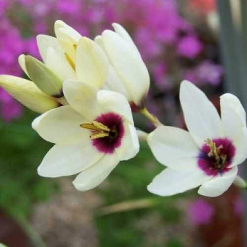 Высота иксии не превышает 50 сантиметров. Листья линейные, остроконечные. Цветки воронковидные, небольшие – 2-4,5 сантиметра в диаметре. Окраска – кремово-белая, кончики каждого лепестка – нежно-сиреневые, основание – пурпурно-рубиновое. Цветение длится около 1 месяца, после срезки, сохраняется в букете 1,5-2 недели.