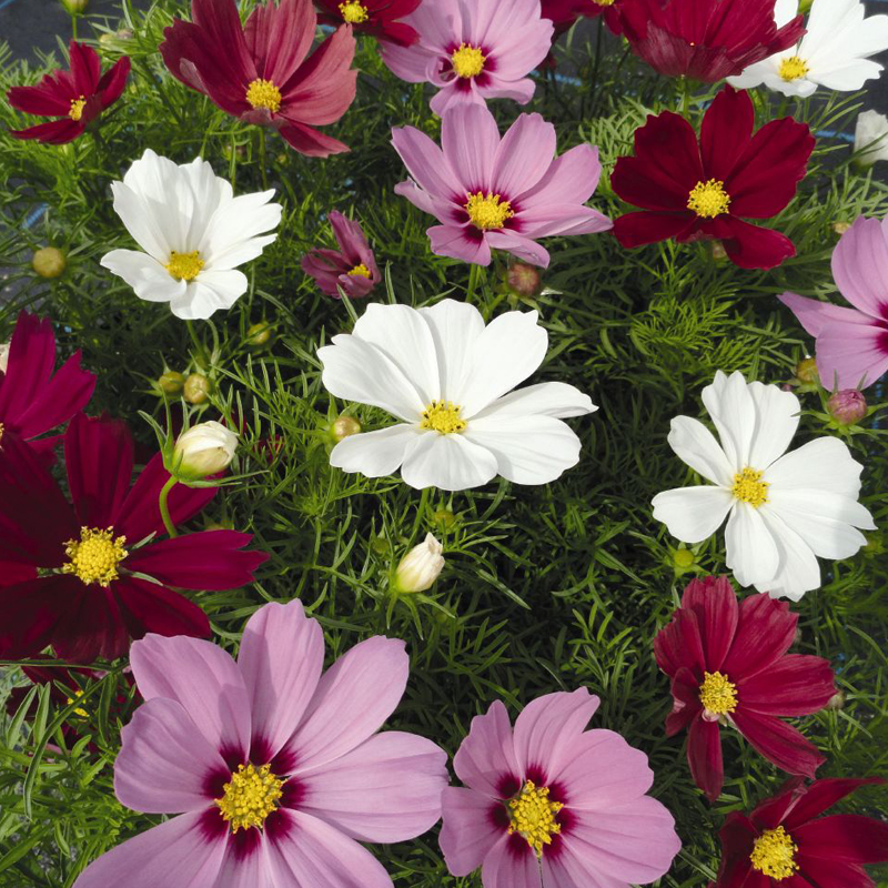Космея сорта Sonata Mix - это настоящее воплощение красоты и изящества в вашем саду. Ее стебли достигают высоты до 60 см, а цветки радуют глаз миксом ярких оттенков. Листья имеют интересную форму, что делает растение еще более привлекательным.