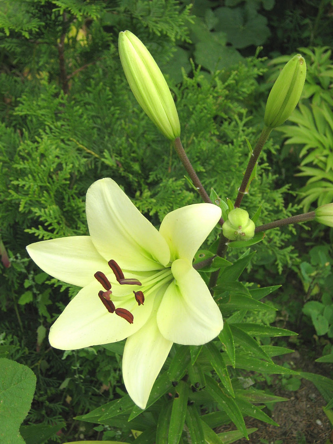 Лилия ла-гибрид Келсо - это великолепное растение с крупными белыми цветками, украшенными желтовато-зеленым центром и темными пыльниками. Ее высота может достигать 110-125 см, а размер цветка поражает воображение - до 20 см! Листья лилии имеют зеленую окраску и прекрасную форму. Это растение предпочитает солнечные и полутенистые места для посадки, идеально подходит для газонов, групповых и одиночных посадок.