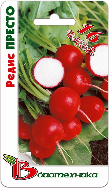Семена редиса "Престо" (Presto) – это раннеспелый высокотоварный сорт, подходящий для выращивания в условиях открытого и закрытого грунта. Также он пригоден для зимнего выращивания в пленочных и стеклянных теплицах. От всходов до технической спелости проходит от 18 до 32 дней в зависимости от условий роста. Корнеплоды округлые, имеют хороший вкус, хрустящие. Примечательно, что они не трухлявеют и способны длительное время сохраняет товарный вид. Культура требовательная к влаге и легким плодородным почвам, семена способны прорастать при температуре 2-4 градуса тепла.