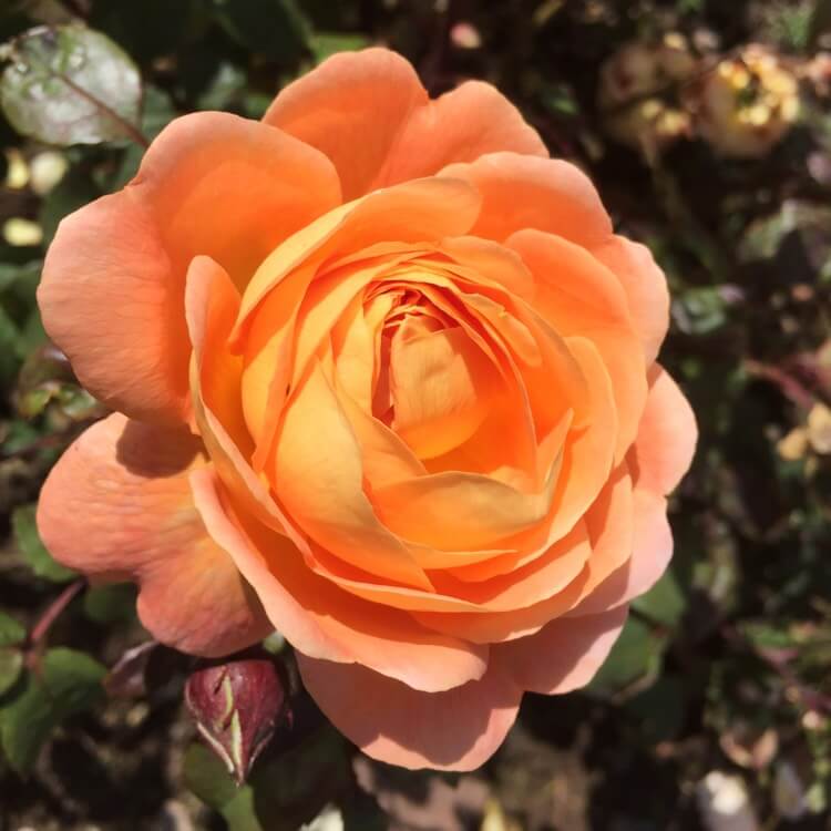 Роза 'Леди Эмма Гамильтон' (Lady Emma Hamilton), созданная знаменитым селекционером Дэвидом Остином в 2005 году, выделяется своими уникальными оттенками, объединяющими оранжевые, жёлтые и розовые тона. На начальном этапе цветения бутон демонстрирует насыщенный оранжевый цвет с золотыми и розовыми акцентами. Постепенно раскрываясь, цветок приобретает более светлые, персиково-розовые оттенки. Крупные бутоны, имеющие чашевидную форму и плотно уложенные лепестки, достигают в диаметре примерно 10–12 см. Роза обладает сильным и стойким ароматом, включающим фруктовые, пряные и чайные ноты, что делает её особенно привлекательной для поклонников ароматных растений.