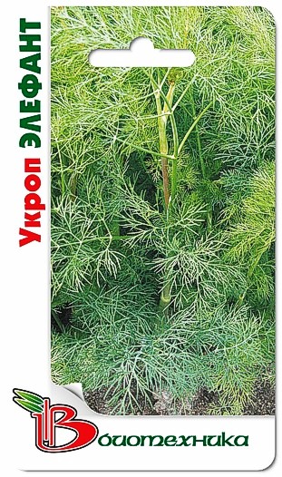 Семена укропа "Элефант" (Elefant) представляют среднеспелый сорт кустового типа. Растение сильнооблиствененное, обладает высокой ароматичностью и отличными вкусовыми качествами. Розетка листьев мощная и полуприподнятая. Листочки крупные, нежные, темно-зеленого цвета, присутствует легкий восковый налет. Сорт устойчив к стрелкованию и отличается быстрым нарастанием вегетативной массы. За сезон можно выполнить две-три срезки. Для получения богатого урожая зелени рекомендуется придерживаться между растениями небольшого расстояния.
